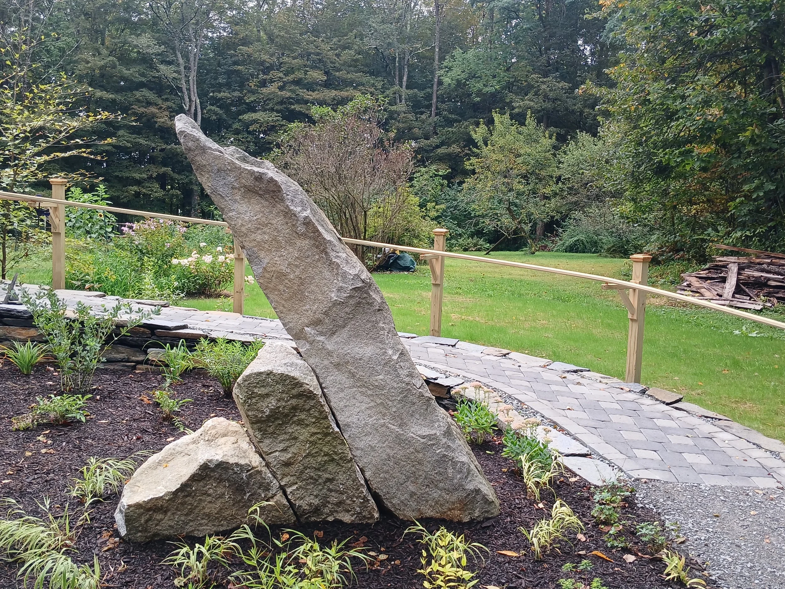 This ‘laid back” sculpture was hand selected weathered granite was selected from a New England quarry and assembled as focal point in the landscape.