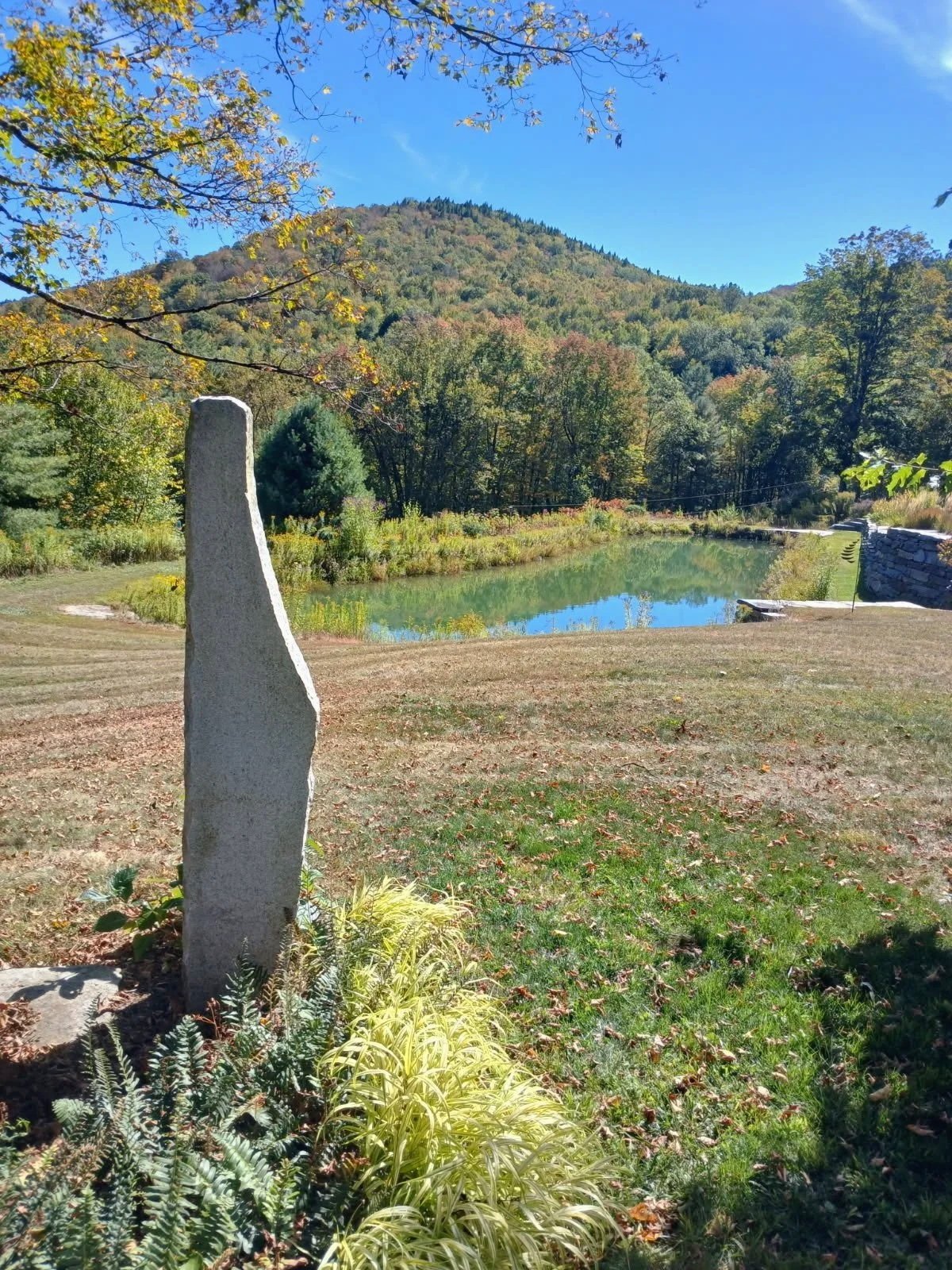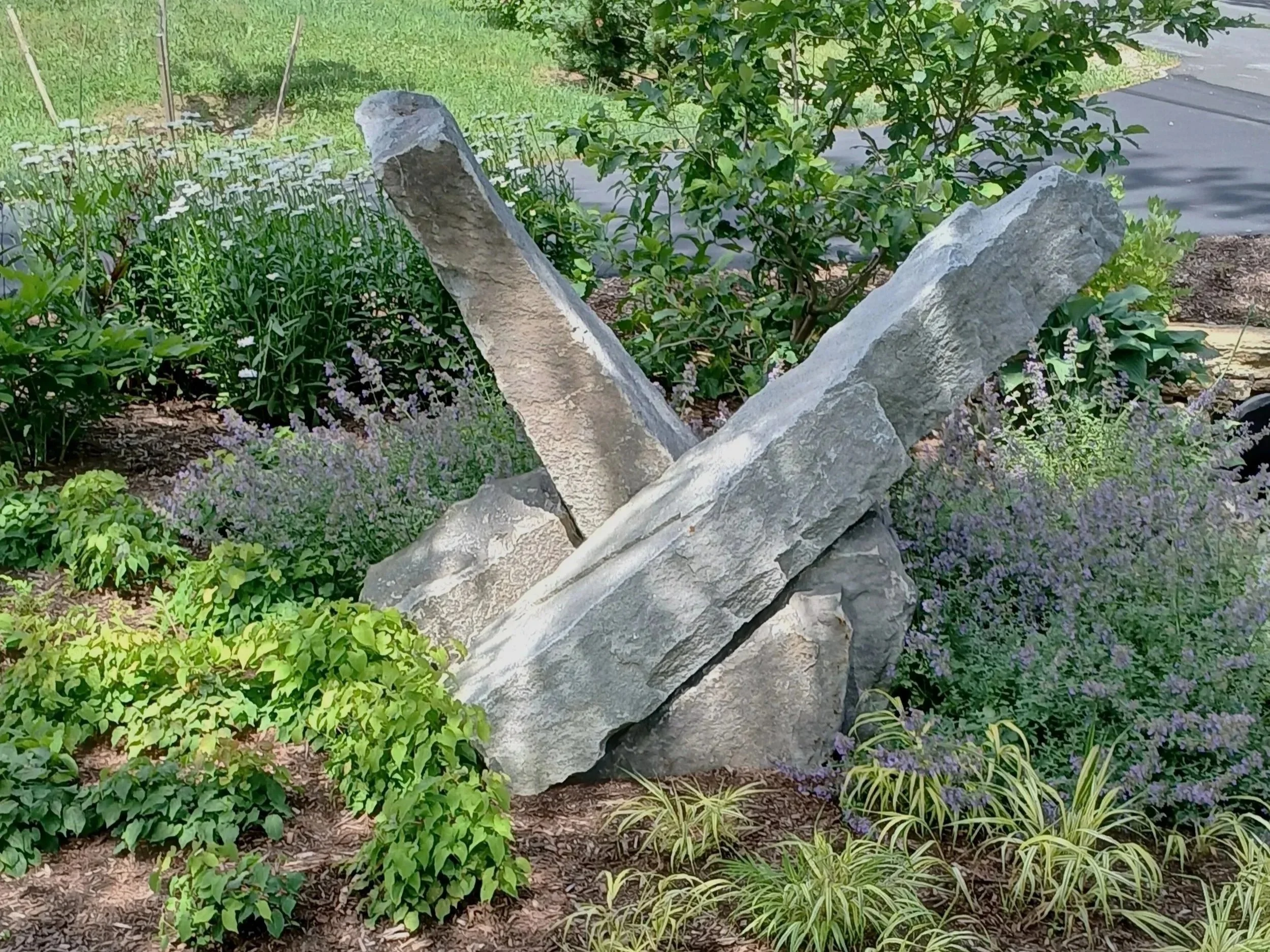 These two 8’ weathered granite “twins” were hand selected from an old quarry in central New Hampshire. They are a stunning focal point in the garden surrounded by lush perennial gardens